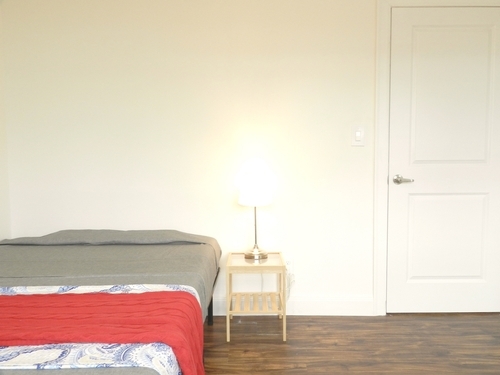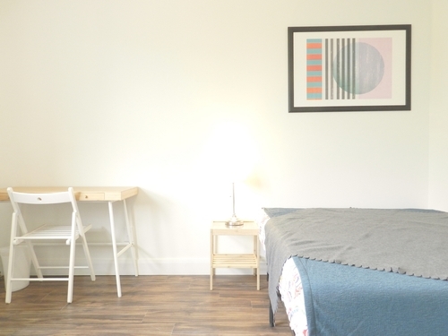 ・フルサイズベッド、机、椅子、ゴミ箱、鏡